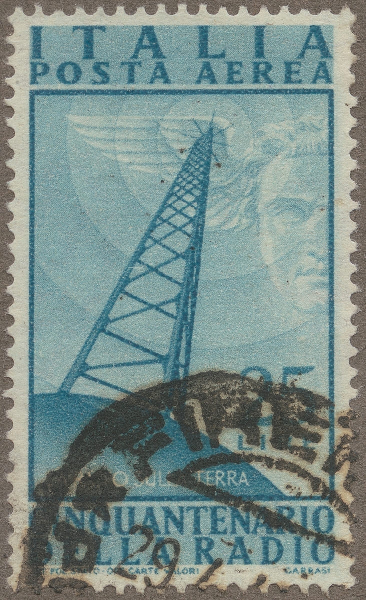 Frimärke ur Gösta Bodmans filatelistiska motivsamling, påbörjad 1950. Frimärke från Italien, 1947. Motiv av Italiensk radiomast med symboliska radiovågor. "50-årsminnet av radion i Italien."