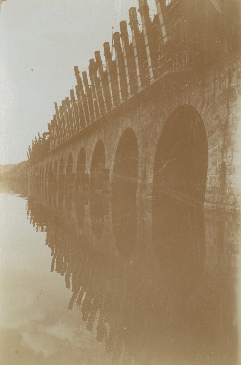 Fotografi från expedition till Spetsbergen. Motiv av bro med trästaket. Troligen från Sveagruvans strand.