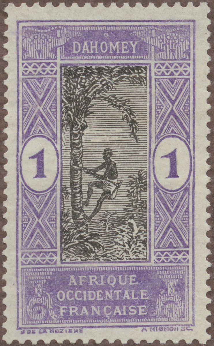 Frimärke från Franska Västafrika, 1913. Motiv av palmskörd i Dahomey.