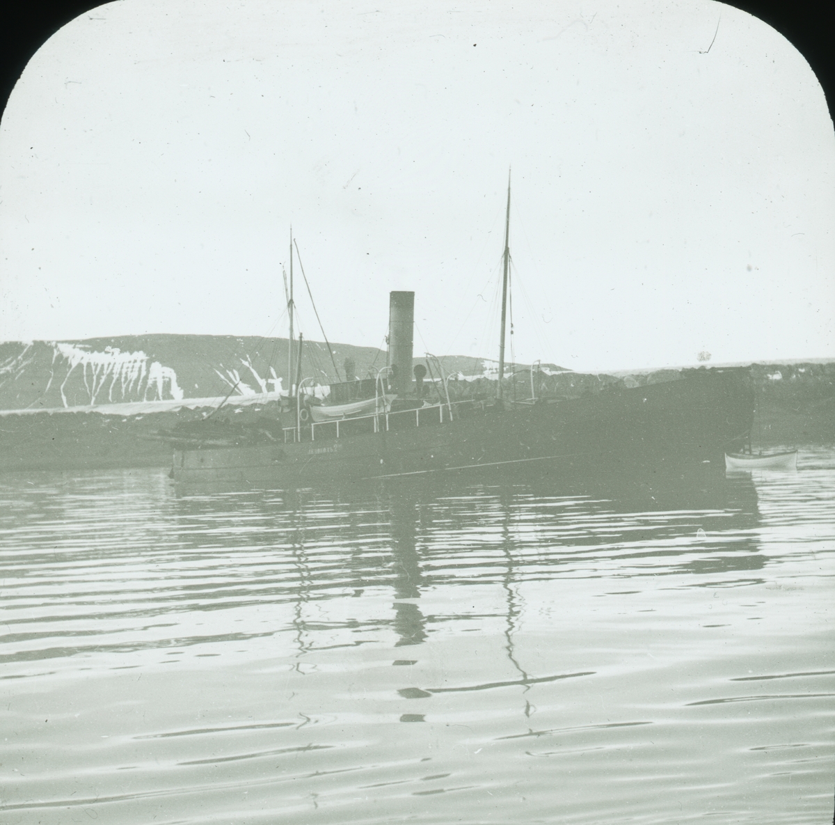 Fotografi från expedition till Spetsbergen. Motiv av fartyg vid berg.
