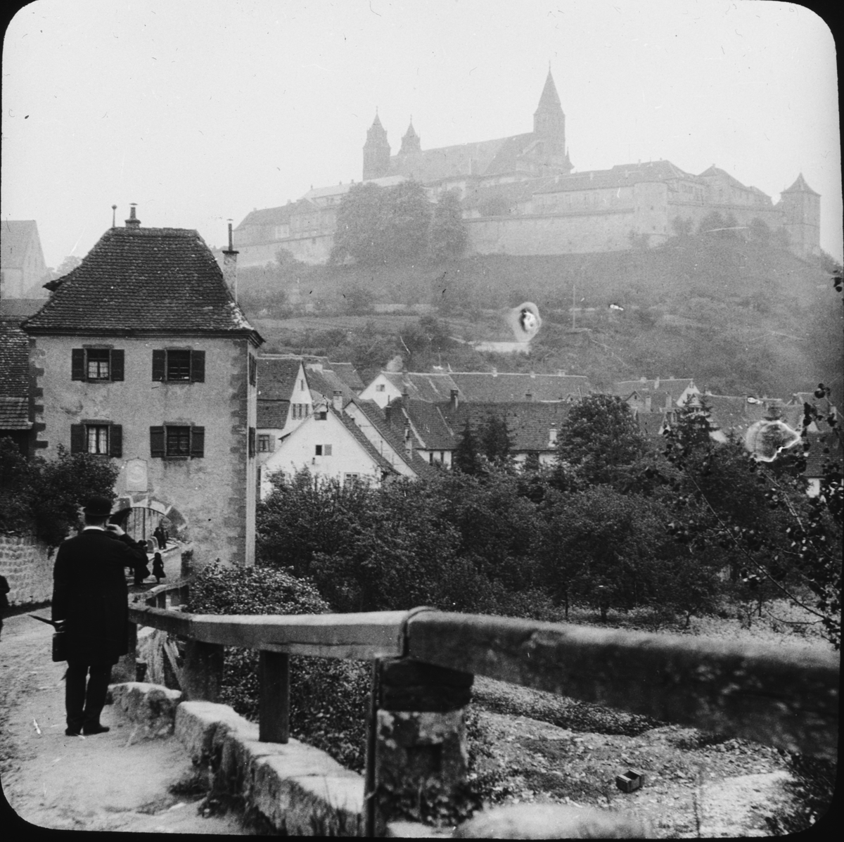 Skioptikonbild med motiv av vy över Schwäbisch Hall med Comburg kloster i bakgrunden.
