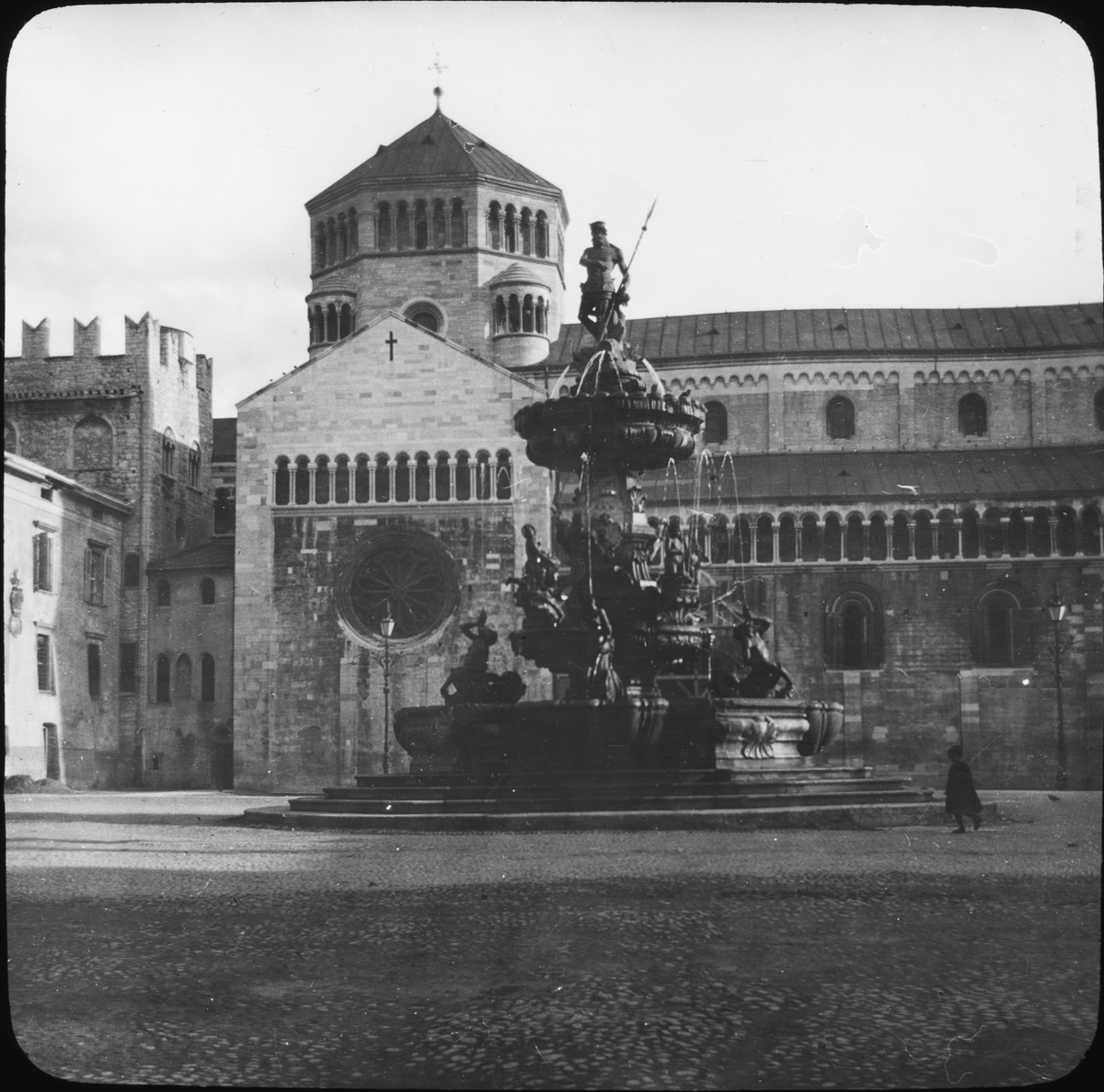 Skioptikonbild med motiv av Neptuns fontän framför Saint Vigilius Katedralen i Trient.
