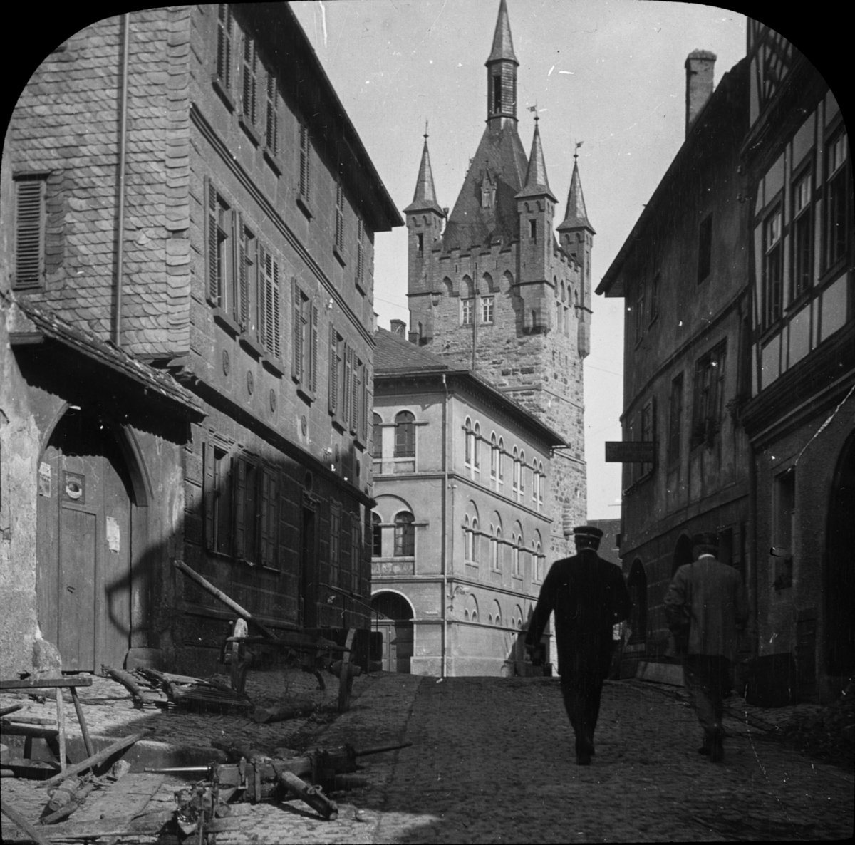 Skioptikonbild med motiv från Wimpfen, med blauer turm i bakgrunden.