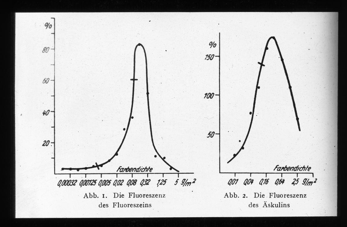 Fluorescensen hos ljusfilter. Vänstra figuren: Fluorescensens styrka vid fluoresceinfilter av olika färgtäthet. Högra figuren: Ett eskulinfilter med färgtätheten 2,5 g per m2 har tagits som enhet.