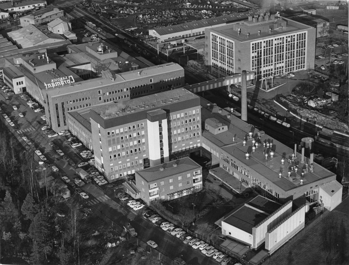 Sandvikens Järnverk (Sandvikens Jernverk). Flygfotografi över Coromantfabriken i Stockholm- vid tiden världens största hårdmetallfabrik, med forskningsanläggning.