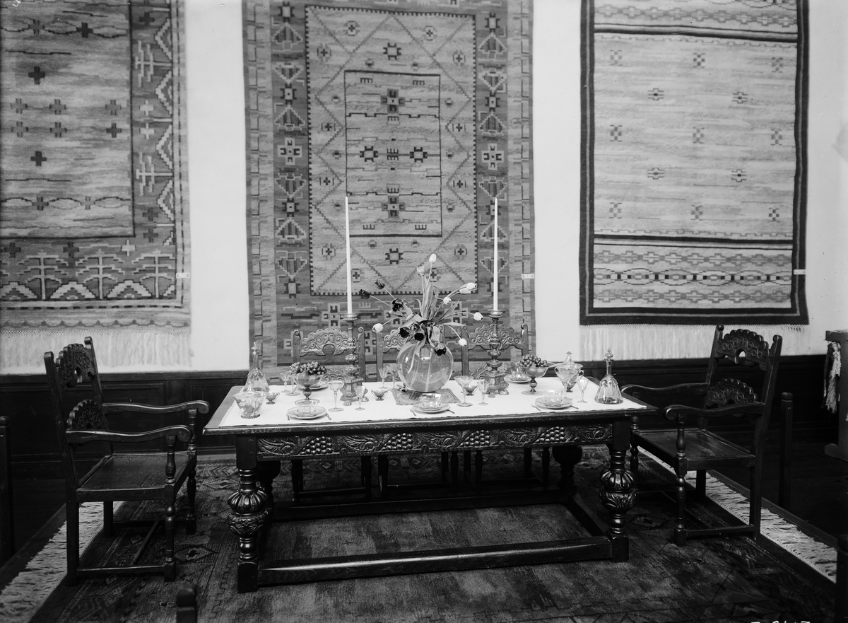 Hantverkets propagandautställning: Mattor + dukat bord med stolar.