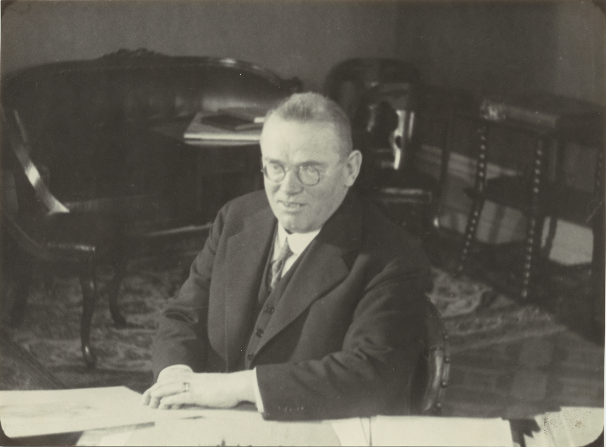Byråchef Lundgren vid sitt skrivbord. Ur albumet "Klipp ur filmen Telegrafverket 1928" av Notarie H. Heimbürger. Utgiven av Svenska Filmer A. B.