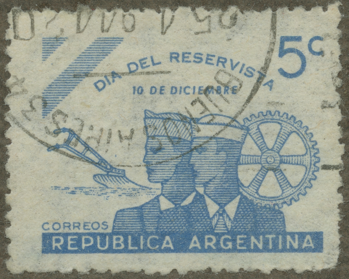 Frimärke ur Gösta Bodmans filatelistiska motivsamling, påbörjad 1950. Frimärke från Argentina, 1944. Motiv av "Symboler Plog Kugghjul Reservisternas dag 10 december"