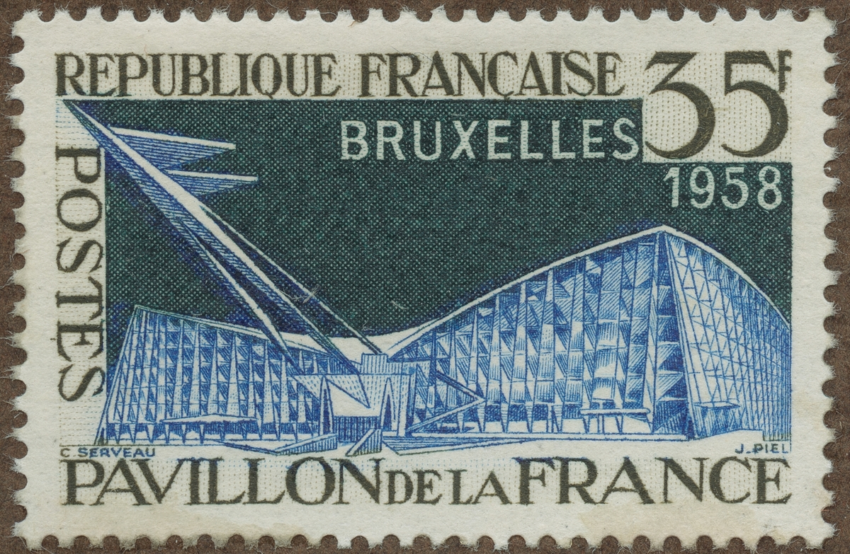 Frimärke från Frankrike, 1958. Motiv av Frankrikes Paviljong Världsutställningen i Bryssel 1958.