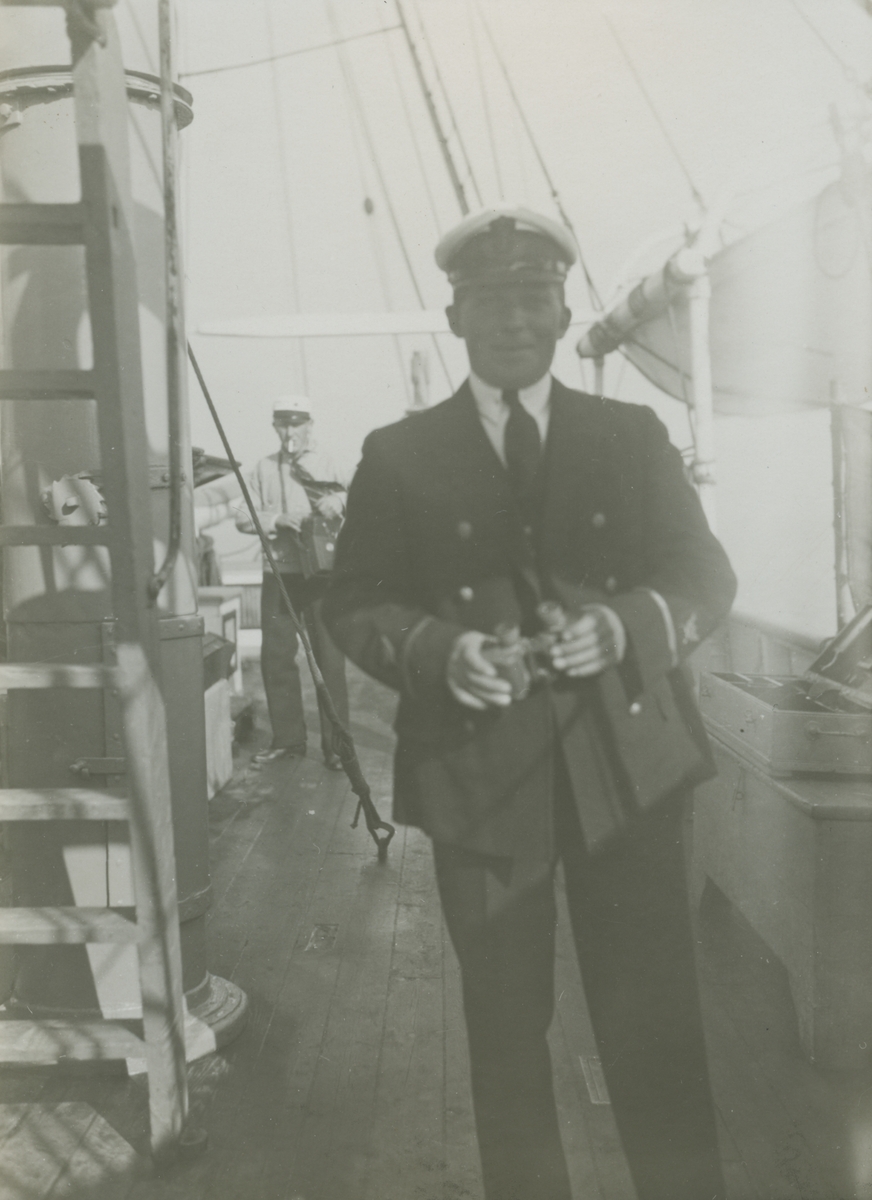 Fotografi från expedition till Östgrönland 1929. Dansk-svensk expedition under ledning av Lauge Koch. Svenska deltagare: Oscar Kulling och Helge Backlund. Motiv av fartygsbesättning ombord på fartyg.