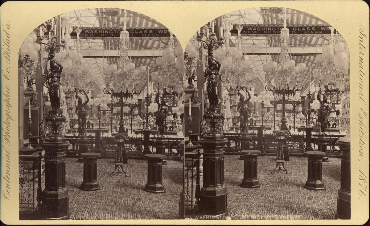 Stereobild, innifrån utställningshall Centennial International Exhibition 1876. "Washington glass works..."