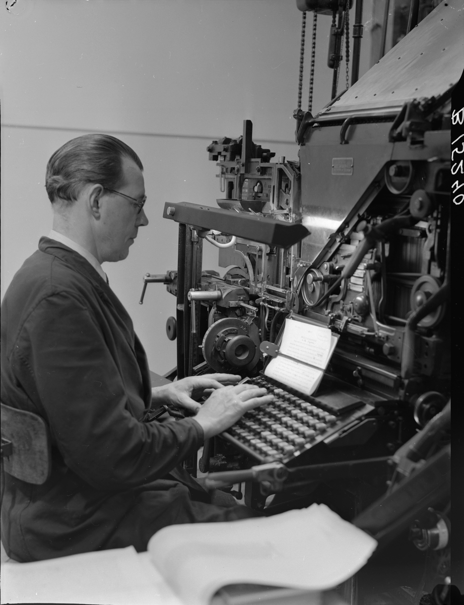 Bild på man vid skrivmaskin/ skrivapparat i fabriksmiljö.