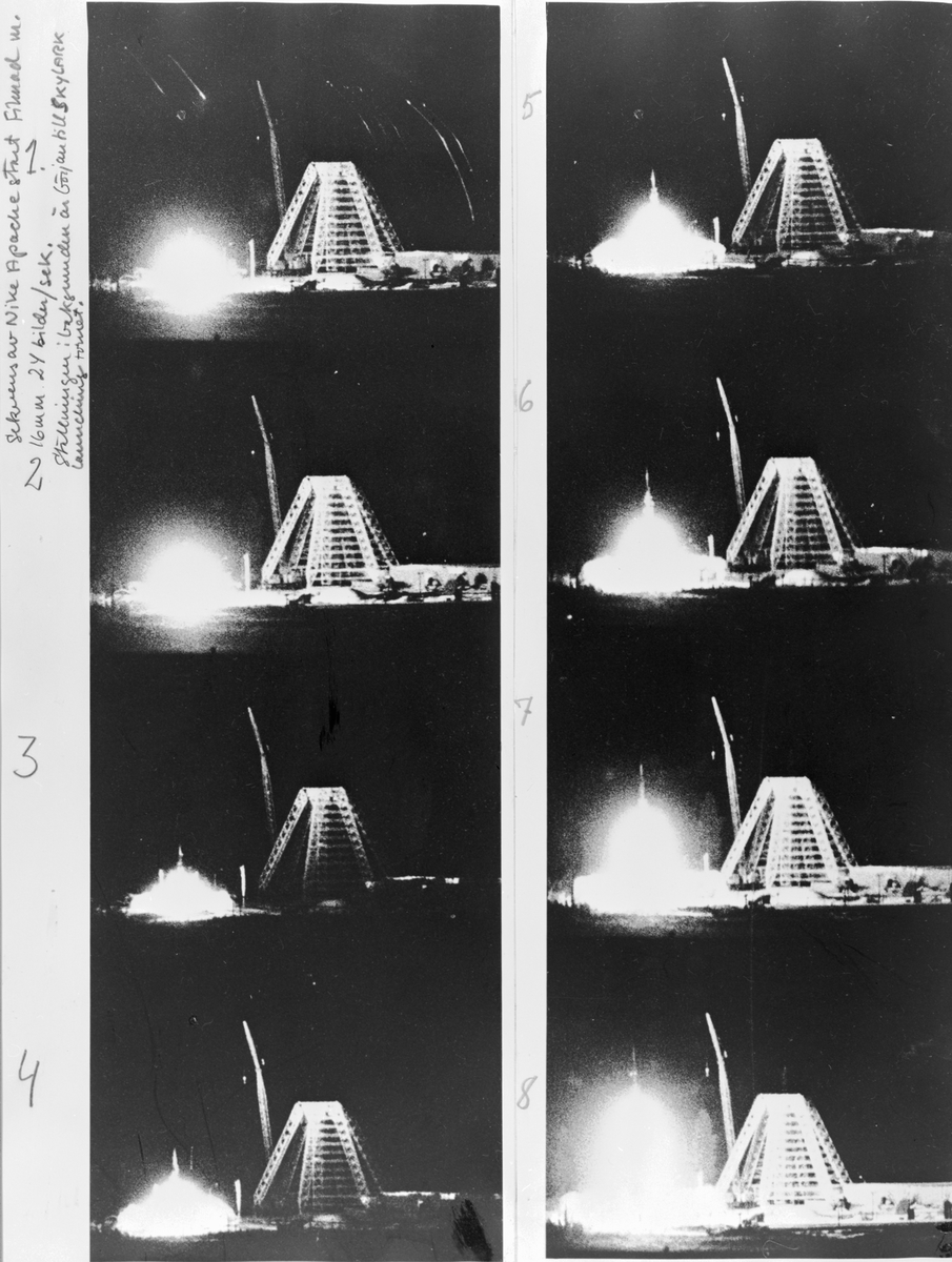 Sekvens av Nike Apache start filmad med 16 mm 24 bilder/sekund. Ställningen i bakgrunden är början till Sky Lark launching tornet. Bildsekvens 1-8.