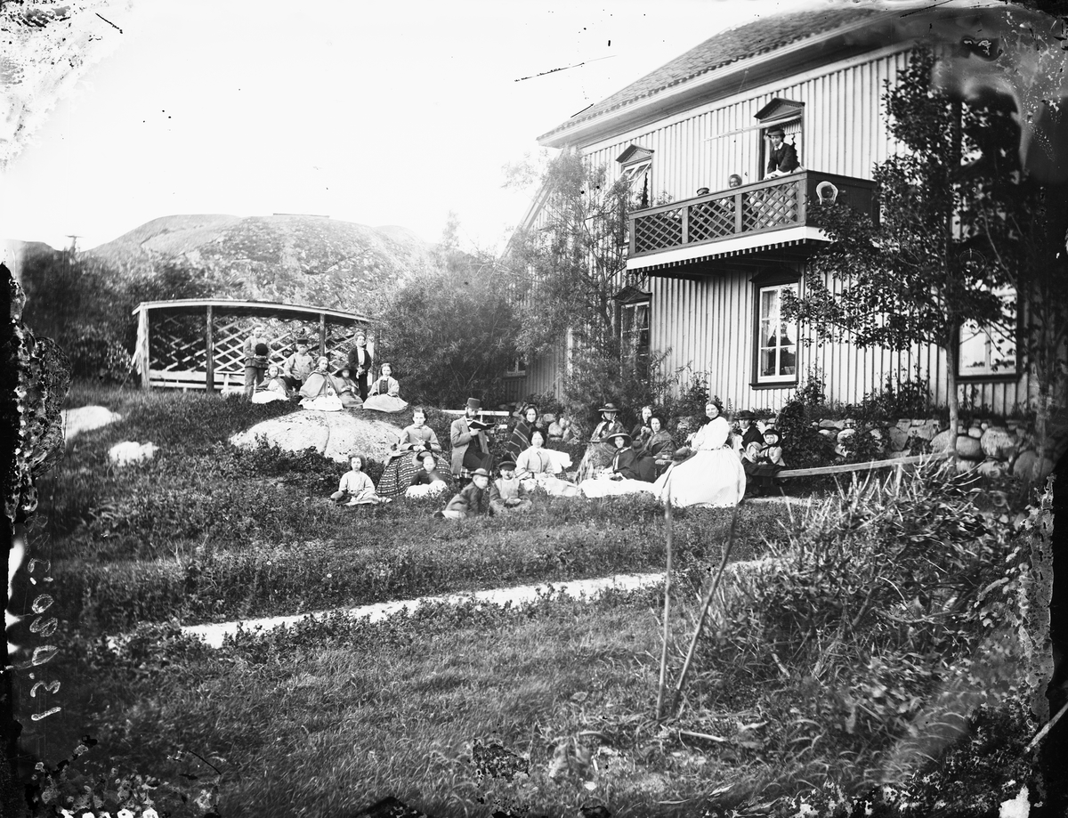 Vid havsbadet i Lysekil sitter en grupp människor på gräset och lyssnar till en man som läser högt ur en bok? Huset i bakgrunden är byggt av Johan Gabriel Mollén.
