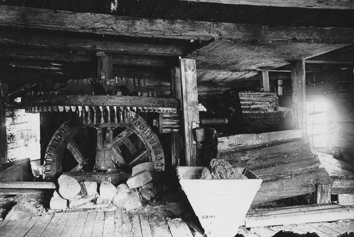Ösjöfors handpappersbruk. Interiör av valshuse. T v gravhjulet och kronhjulet och t h valskistan.