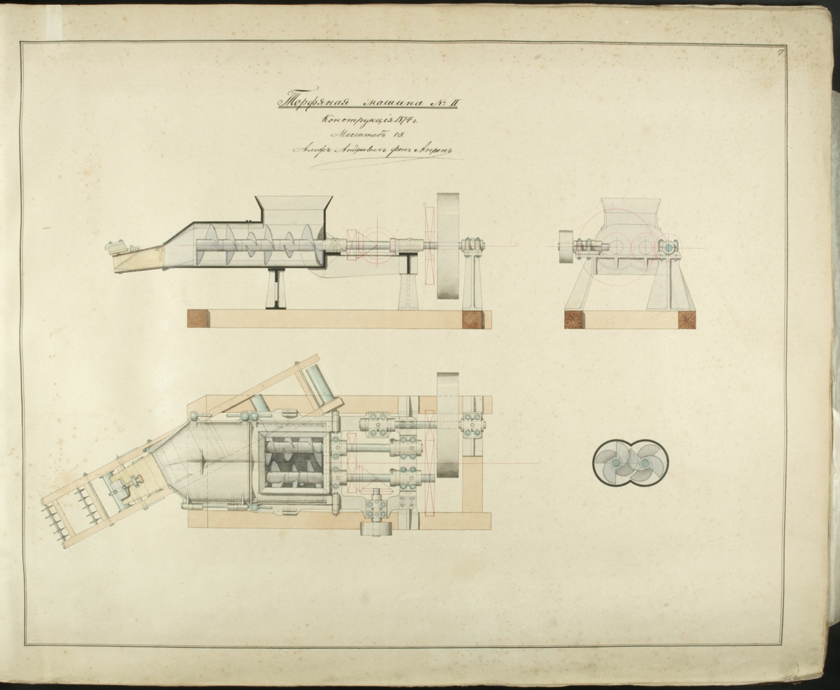 Skiss på ryska 1874, ur boken med ritningar mm 1868-1887, av den svenske torvmaskinkonstruktören Aleph Anrep.
