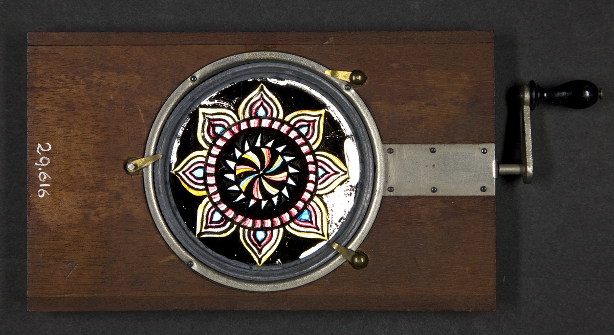 Handmålad bild på glas för skioptikon/laterna magica. Optiskt mönster, vev för att åstadkomma rörelse i bilden.