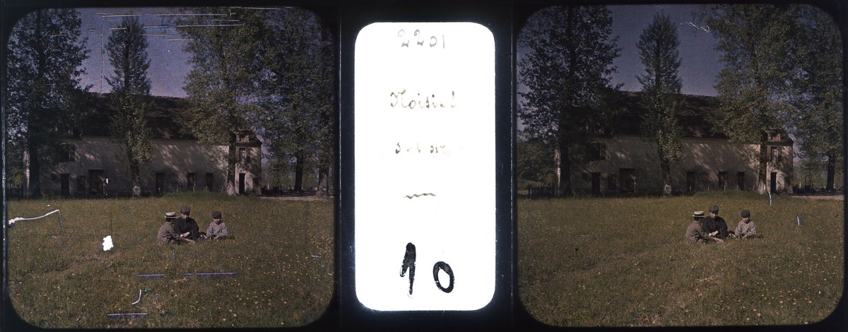 Stereobild av kyrka? med pojkar på äng i förgrunden.