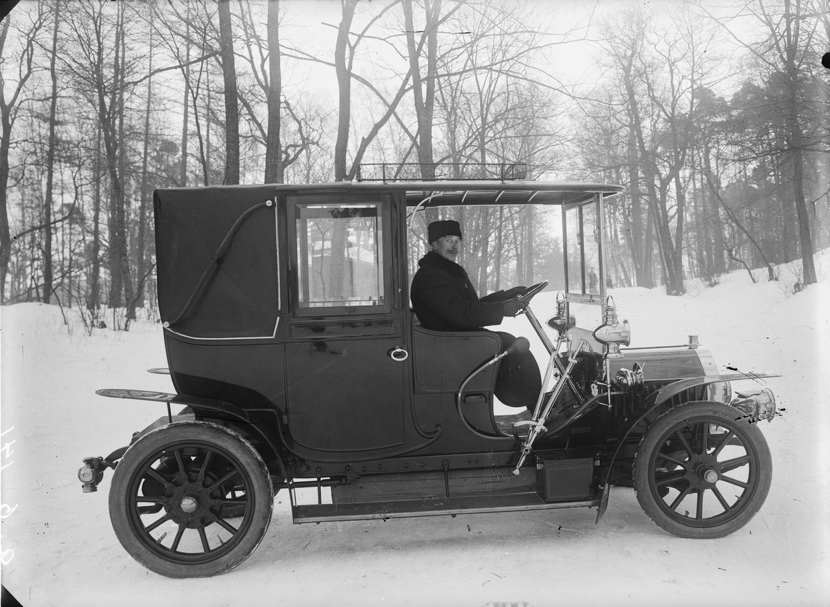 Man i bil tillverkad vid Gustav Ericssons Automobilfabrik.