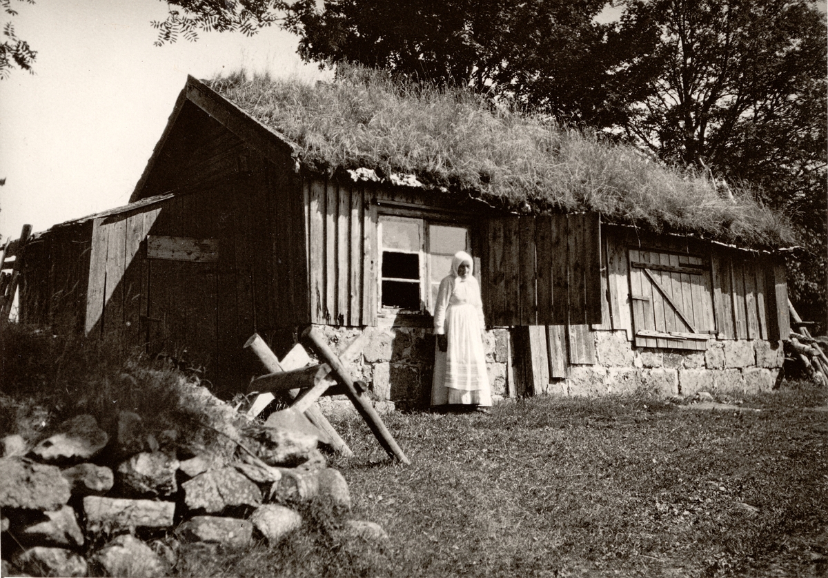 Exteriör av "patronfabriken" vid Tabergs gruvor jämte en av de kvarlevande arbetskorna. Här tillverkades åren 1872-1899 de patroner i papp i vilka nitroglycerin nedfördes i borrhålen.