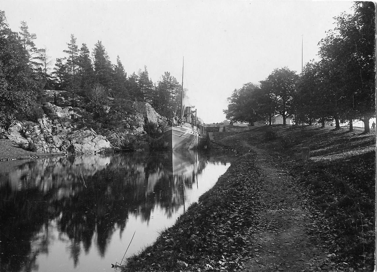 Kanalbåten Örebro I vid Säby Slussar, Hjälmare kanal. Bild från tidskriften Hemmets bildmaterial.