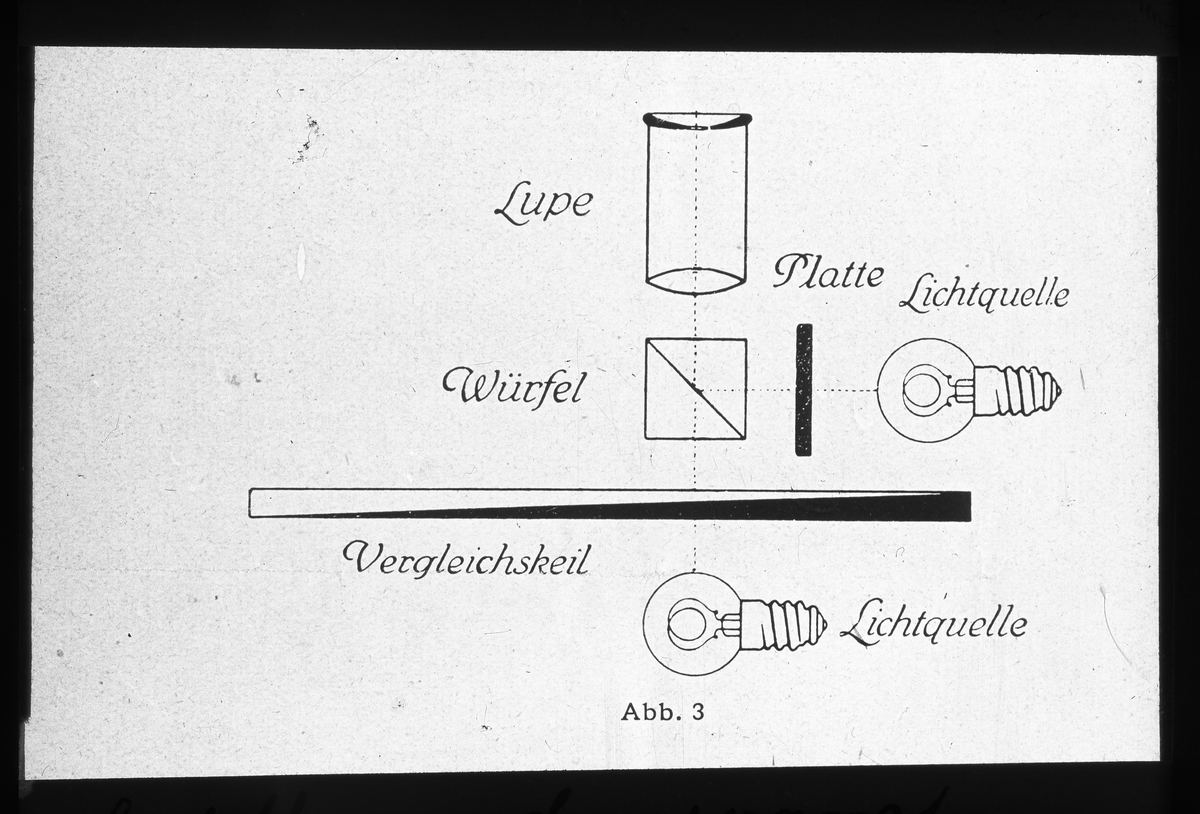 Skioptikonbild från Institutionen för fotografi vid Kungliga Tekniska Högskolan. Använd av professor Helmer Bäckström som föreläsningsmaterial. Bäckström var Sveriges första professor i fotografi vid Kungliga Tekniska Högskolan i Stockholm 1948-1958.