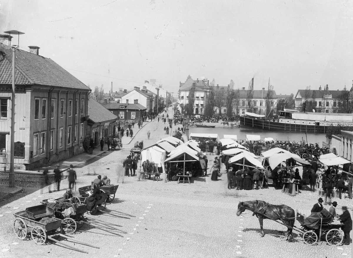 Torgmarknad på Rådhustorget vid hamnen och Kungsgatan i Eskilstuna före 1895.