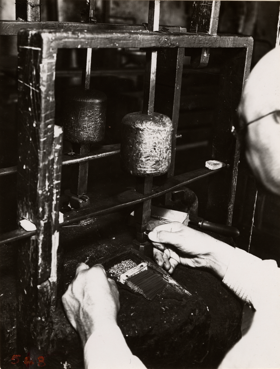 Knappnålstillverkning vid J.H. Tidbeck Metallduksväveri och Metalltrådsvarufabrik. Fastsättning av knappar på skaften.