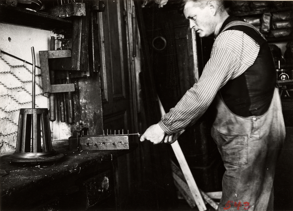 Knappnålstillverkning vid J.H. Tidbeck Metallduksväveri och Metalltrådsvarufabrik. Trådriktning i riktholt.