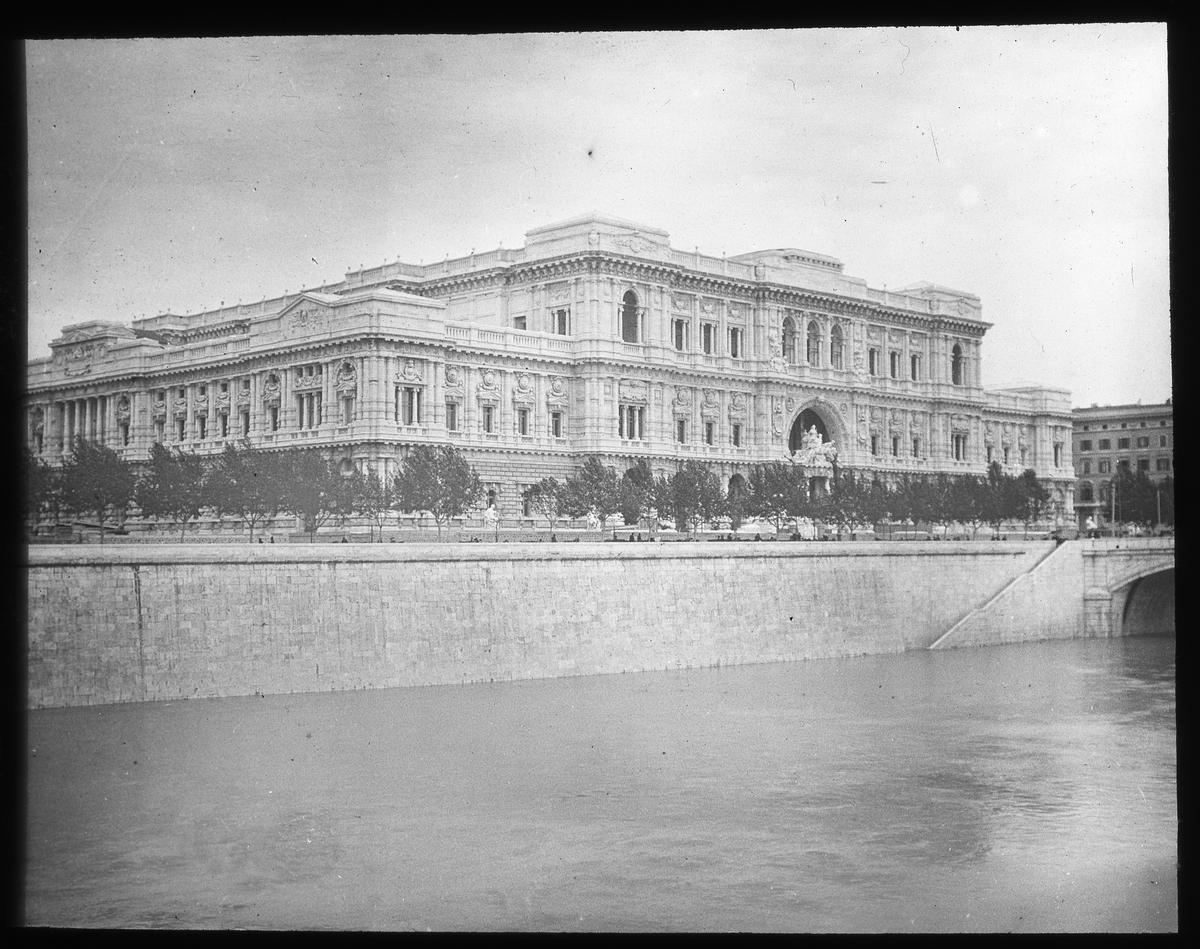 Skioptikonbild från institutionen för fotografi vid Kungliga Tekniska Högskolan. Motiv föreställande Justitiepalastet i Rom. Bilden är troligen tagen av John Hertzberg under en resa i Europa.