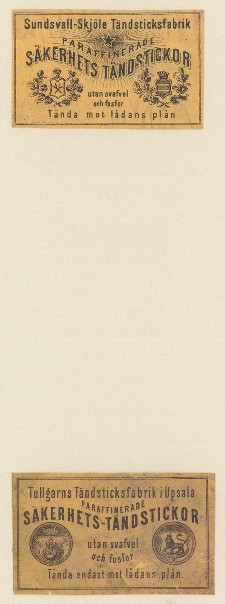 Etiketter för tändsticksaskar, från Svenskt Industri- och Handelsmuseum.