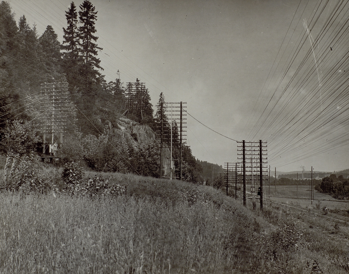 Telegrafverkets stolplinjer utefter järnvägslinjen från Stockholm söderut omkring år 1925.