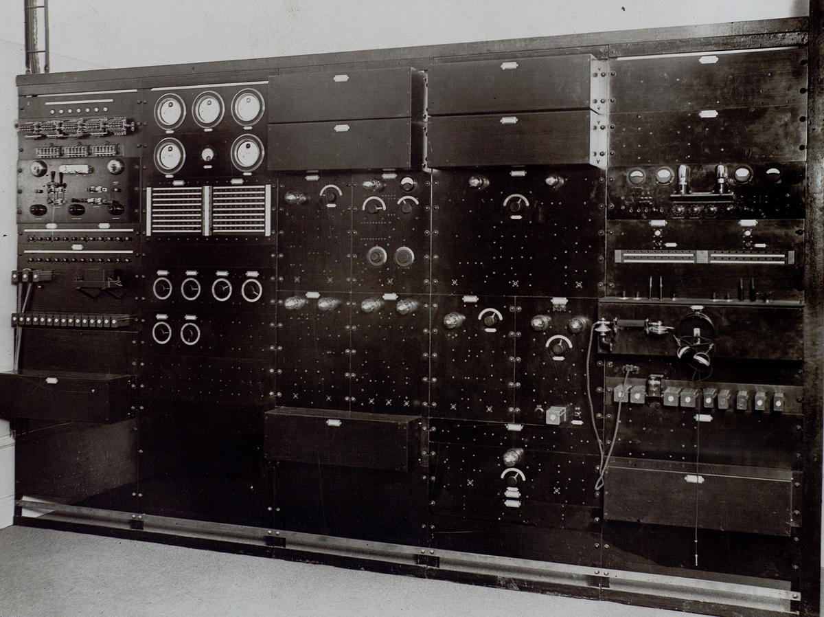 Överdragsstationen i Stockholm. Första bärfrekvensstativet. Troligen 1919.