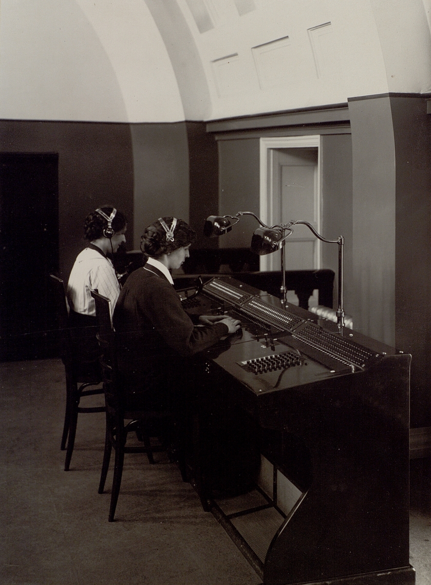 Landskrona. Halvautomatiska stationen 1923. Knappsatsbord för avgående trafik. Abonnentapparaterna ej utrustade med fingerskiva.