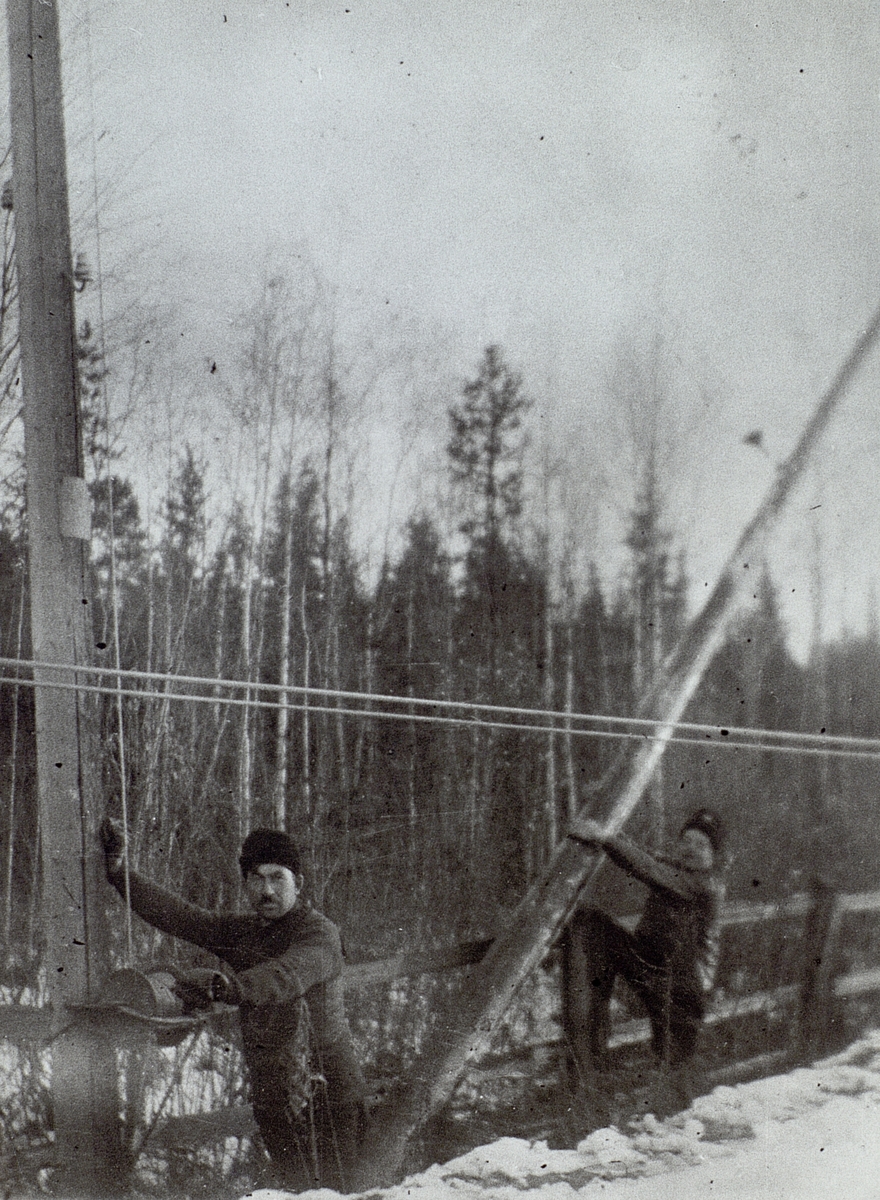 Stolpsättning strax utanför Ljusdal 1920-talet. Thorell och Klas Wennberg.