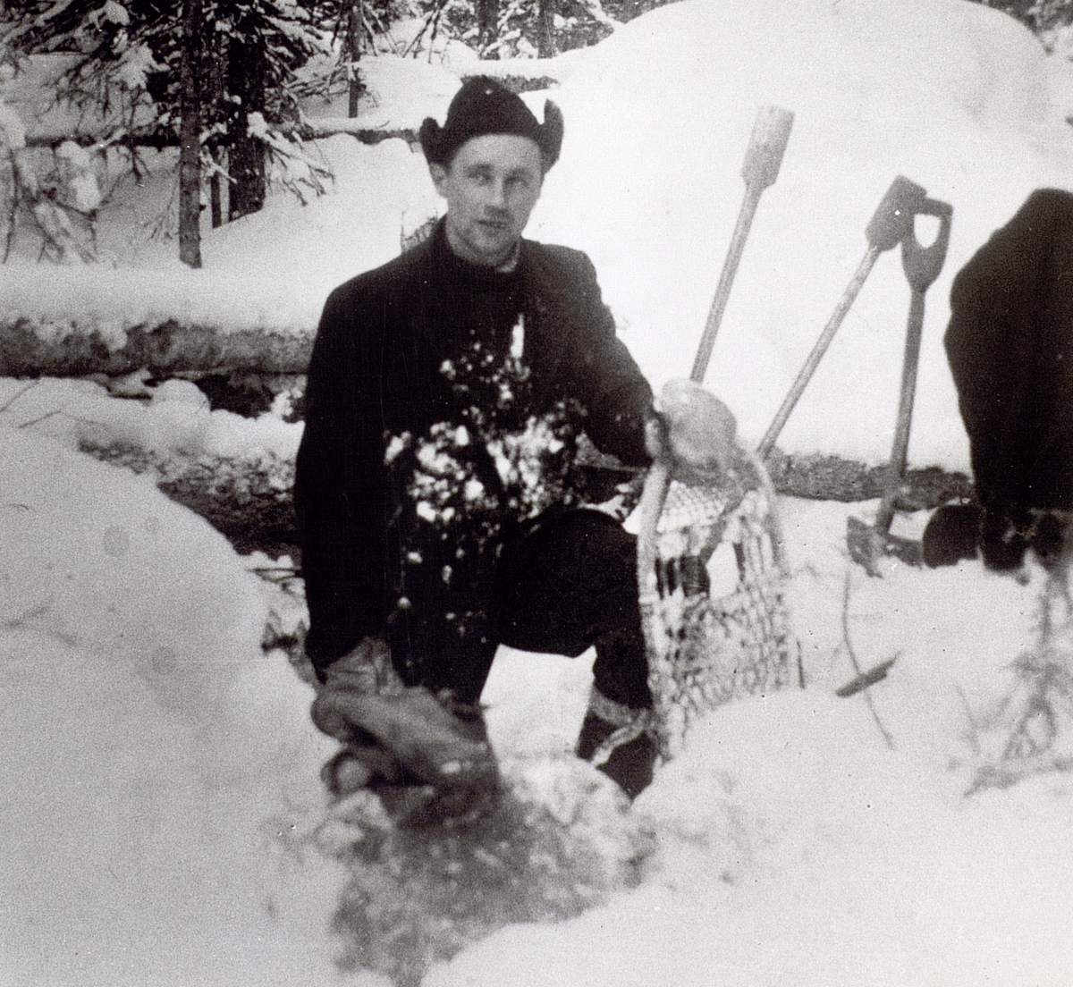 Lasse Westner på stolpsättning till Vakåsen 1954. Det var mycket snö och snöskorna kom väl till pass. I bakgrunden ett par klackspett.