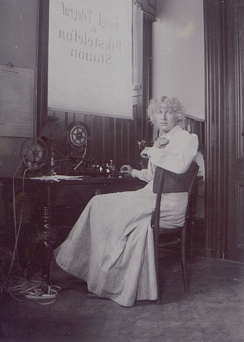 Okänd telegrafstation. Interiör av liten telegrafstation med telegrafist. Bilden tagen omkring sekelskiftet 1900.