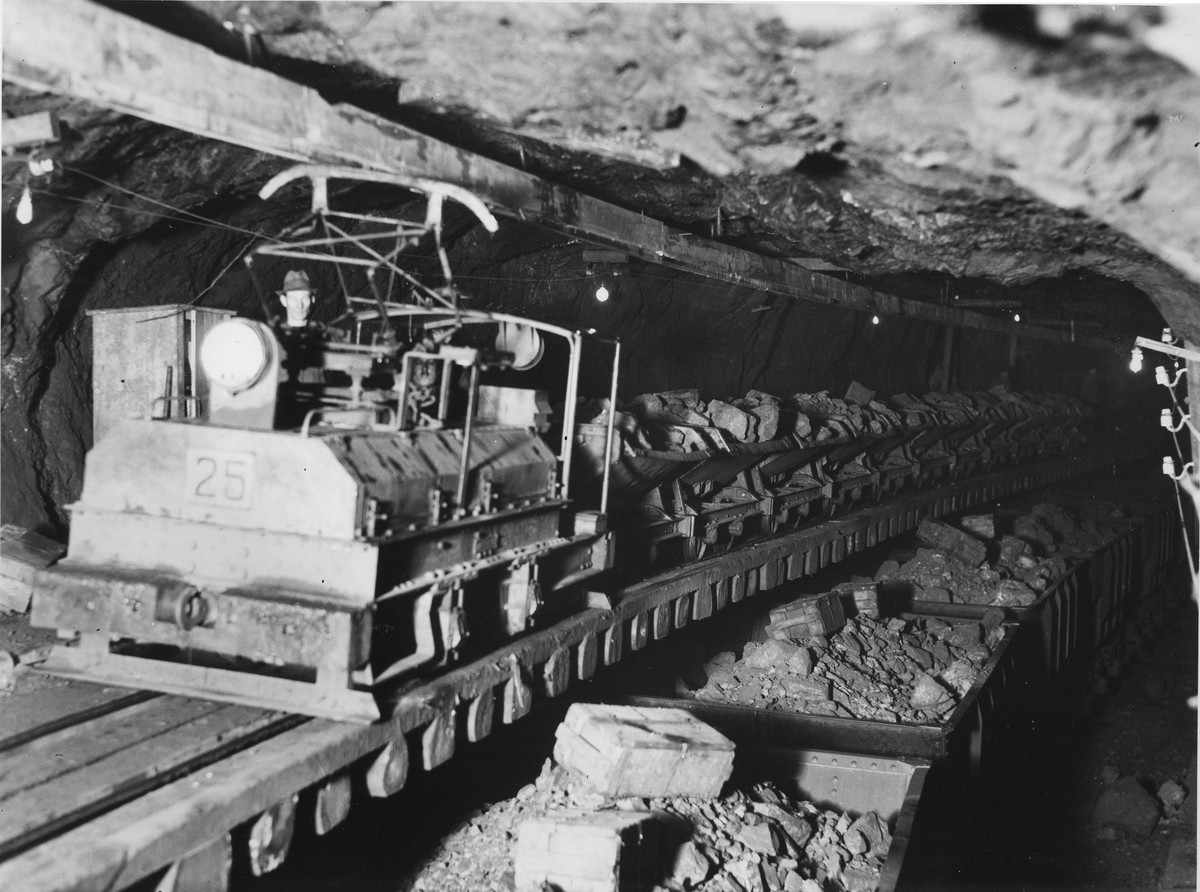 Tömning av malmmagasin i järnvägsvagn vid gruvan i Kiirunavaara.