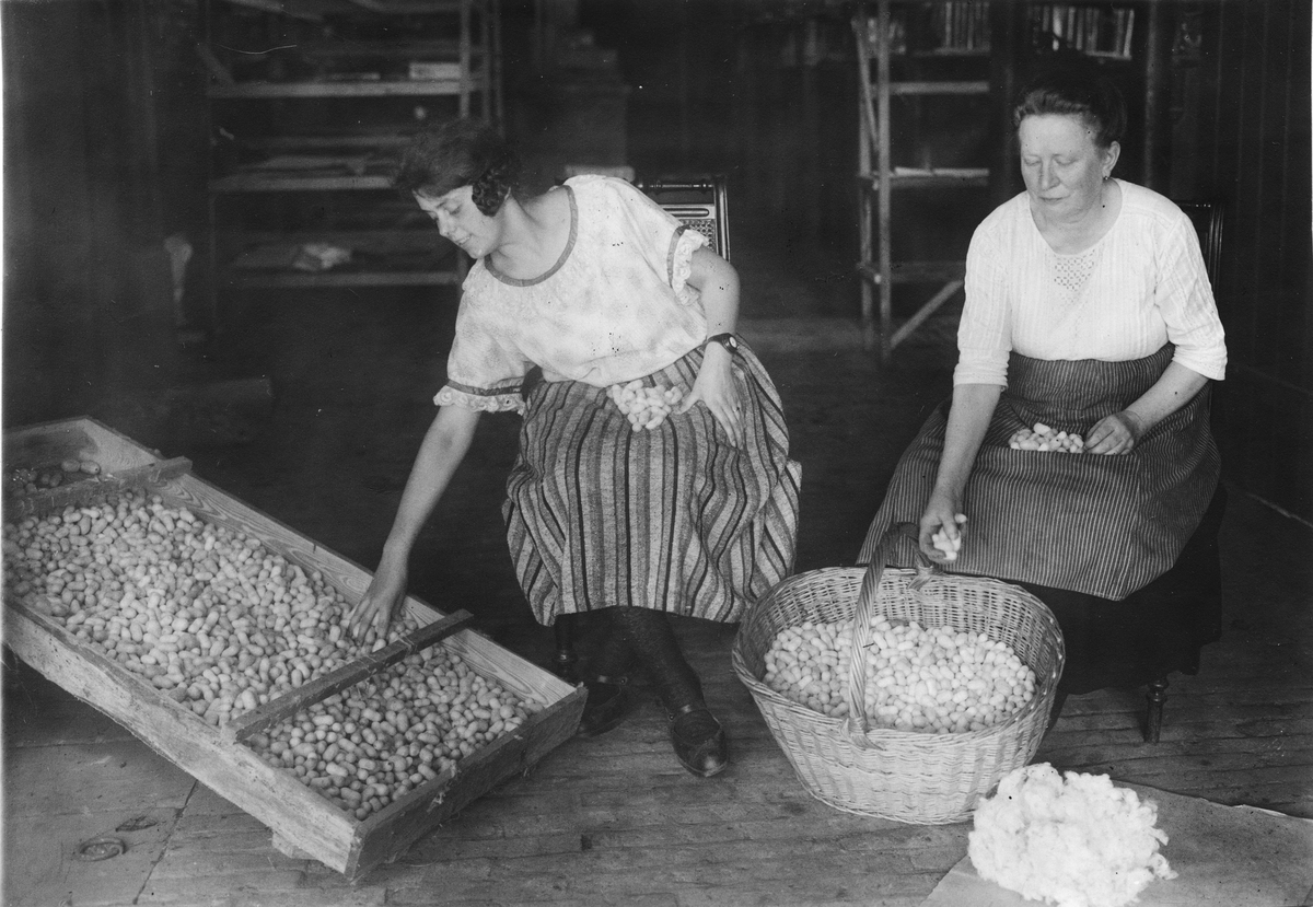 Silkesarbetare i Sanssouci, Potsdam. Silket tas bort från kokongerna.