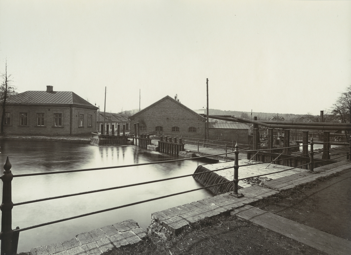 Boxholms Järnverk. Vy över smedjedammen med ritkontoret och mekaniska verkstaden omkring 1920.