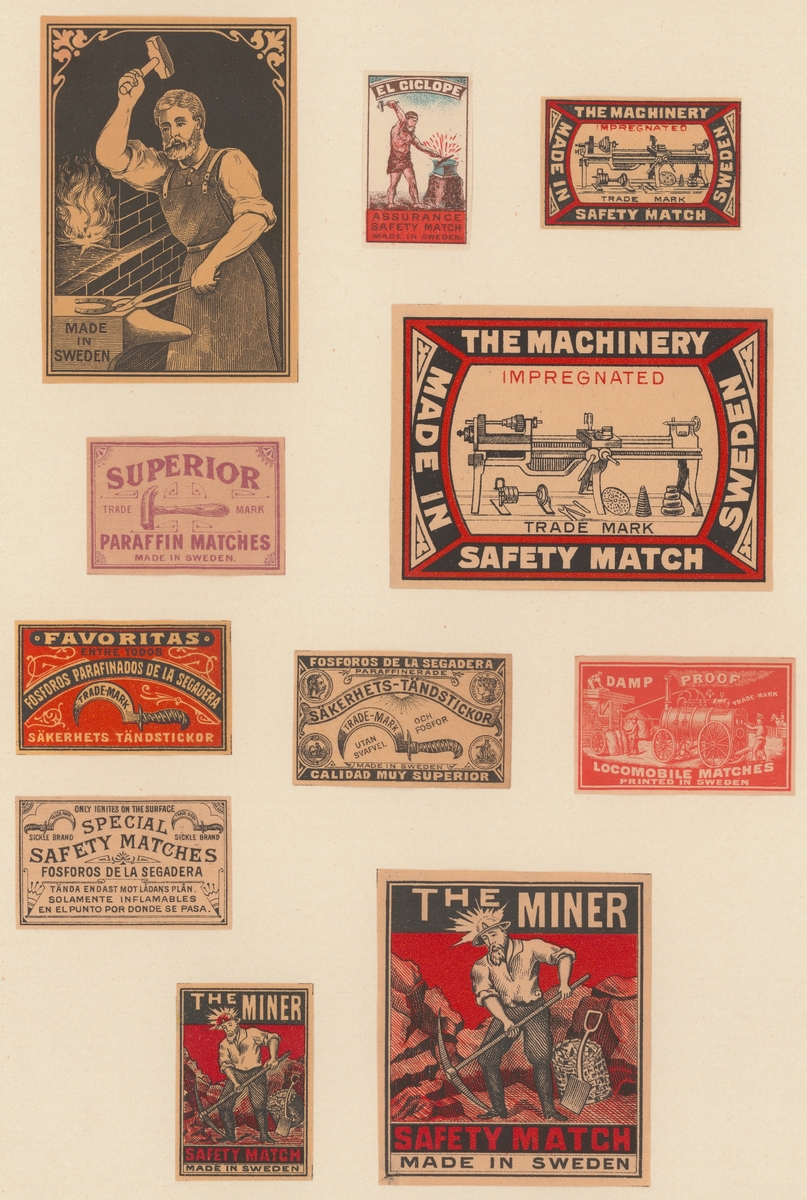 Etiketter för tändsticksaskar, från Svenskt Industri- och Handelsmuseum.