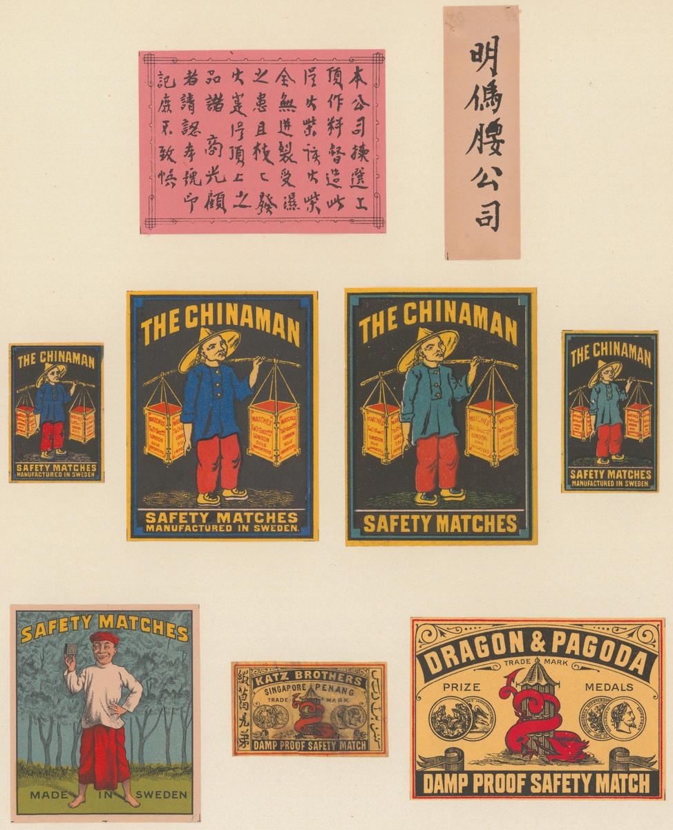 Etiketter för tändsticksaskar, från Svenskt Industri- och Handelsmuseum.