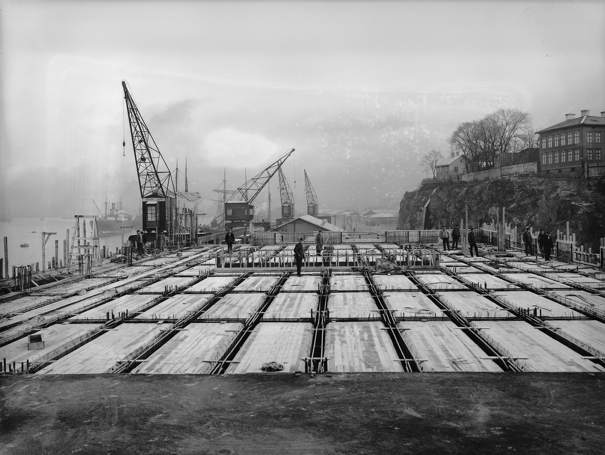 Byggherre: Byggnadsaktiebolaget Contractor, Stockholm. Grunden byggs för varuskjul vid Stigbergskajen, Göteborg.