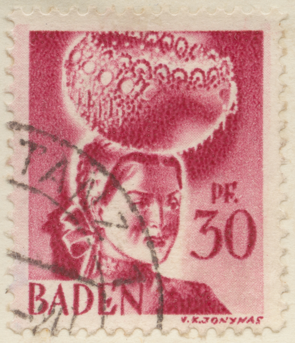 Frimärke från Baden, Tyskland, 1948. Motiv av kvinna med huvudbonad för fest.