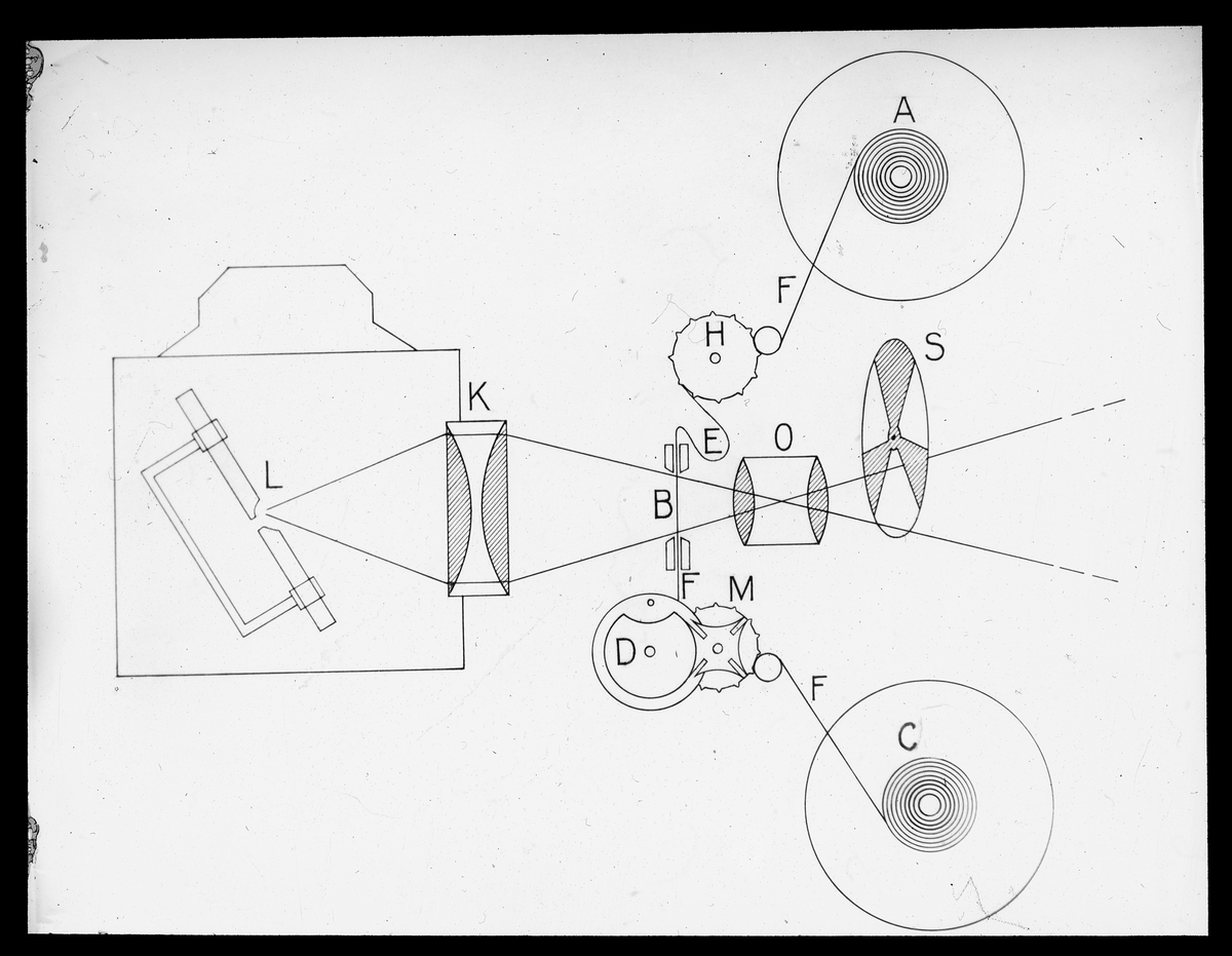 Filmprojektorns huvuddelar. A=Filmhjul, B=Bildfönster, C=Upptagningsfilmhjul, D=Intermittens-mekanism, E=?, F=Film, H+M=Matarehjul med anliggare, K=Kondensor, L=Lampa, O=Objektiv, S=Slutare.
