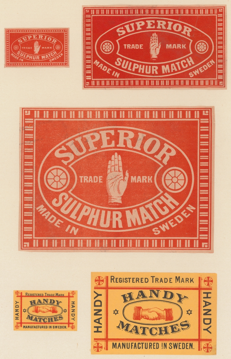 Etiketter för tändsticksaskar, från Svenskt Industri- och Handelsmuseum.