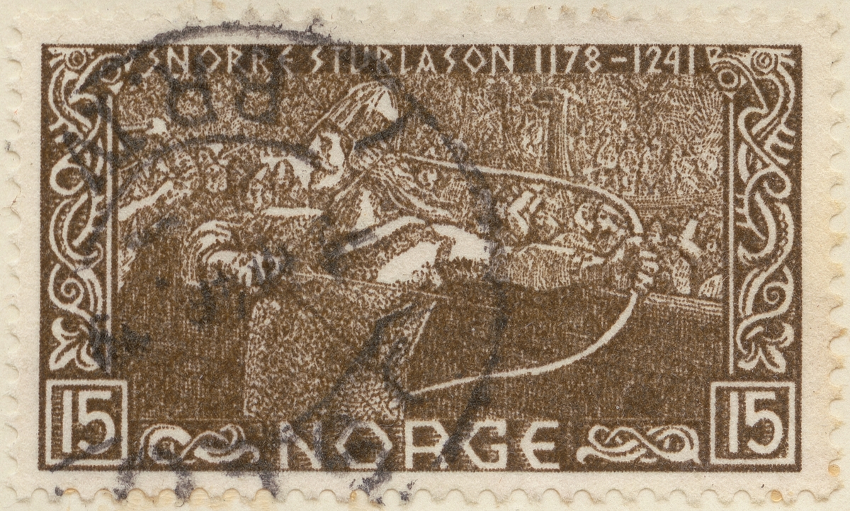 Frimärke från Norge, 1941. Motiv av Norsk bågskytt. 1200-talet -700-årsminne av Snorre Sturlasons död: 1241-1941. (Snorre Sturlason: 1178-1241) Isl. historiker. Utgav Norges Kungasagor och en fornisl. poetik Edda)