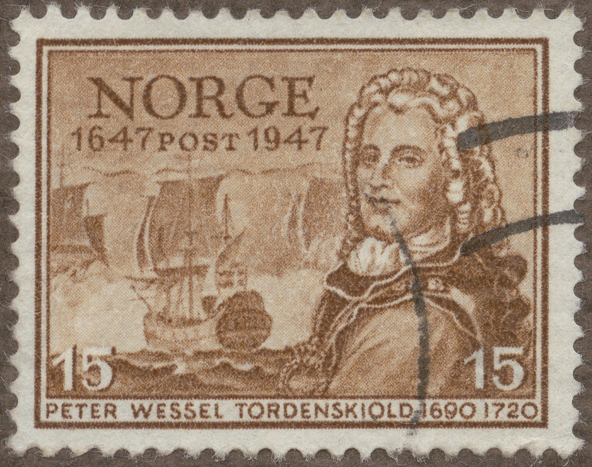 Frimärke från Norge, 1947. Motiv av Norsk fregatt kring år 1700. (t.h.): Vice-amiral Peter Wessel Tordenskiold: 1690-1720. Norsk-dansk sjöofficer. Dödad i duell av sv.översten J.A. Staël von Holstein. -Norges postväsen 300 år: 1647-1947:
