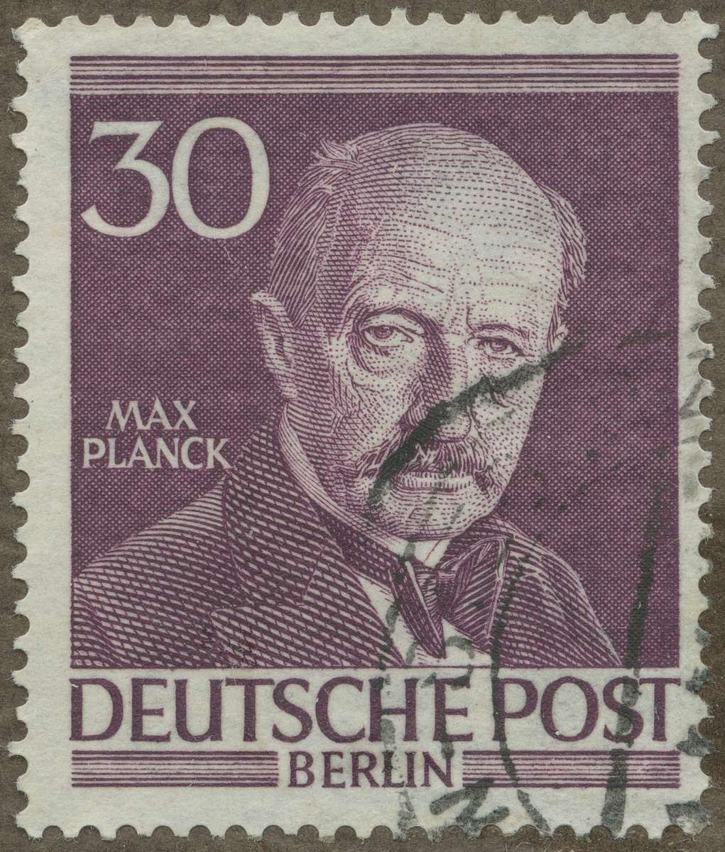Frimärke från (Berlin) Tyskland, 1953. Motiv av Max Planck 1858-1947 Tysk fysiker. Värmestrålning Uppställde kvant-teorien Nobelpris i fysik 1918