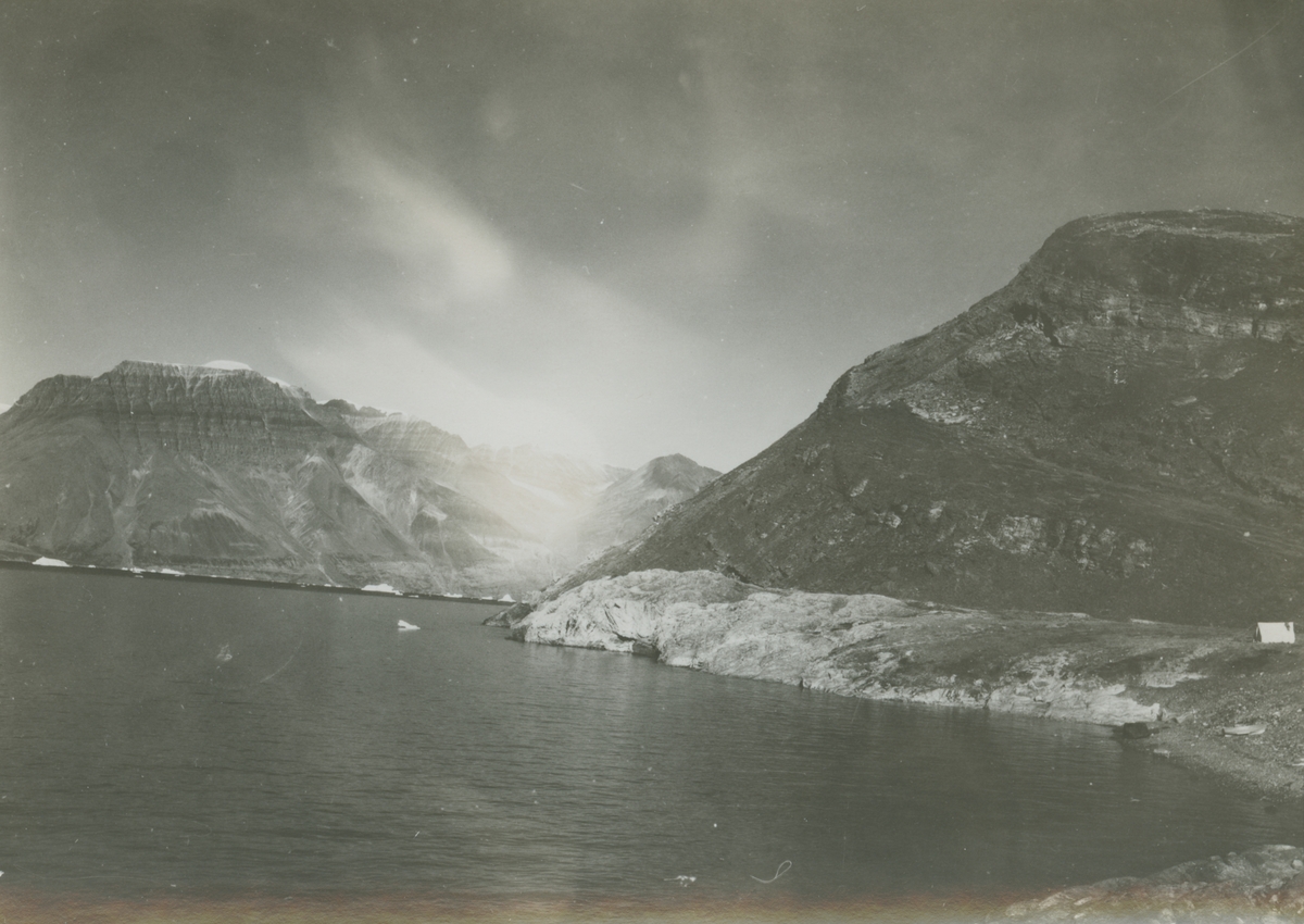 Fotografi från expedition till Östgrönland 1929. Dansk-svensk expedition under ledning av Lauge Koch. Svenska deltagare: Oscar Kulling och Helge Backlund. Vy över hav, snötäckta berg och molnprydd himmel.
